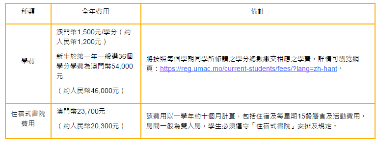 以澳门大学为例,学费需人民币46000元,住宿费需人民币20300元。