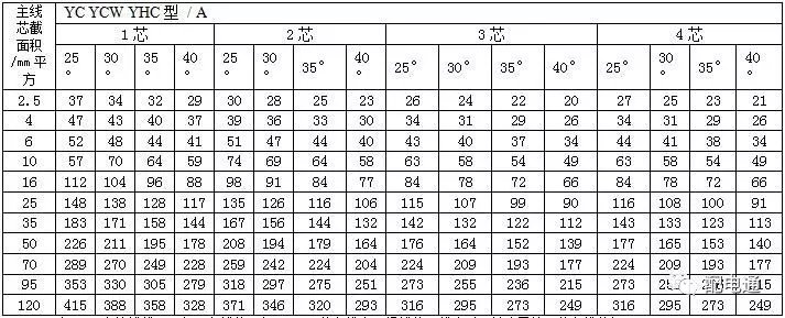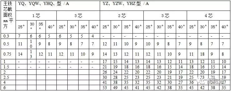 4通用橡套软电缆的载流量(450V/750V及以下橡胶绝缘电力电缆YQ、YQW、YHQ、YC、YCW、YHC型号的载流