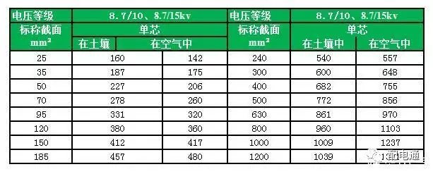 YJV、YJY、YJV22电压等级8.7/10、8.7/15kv电缆载流量表: