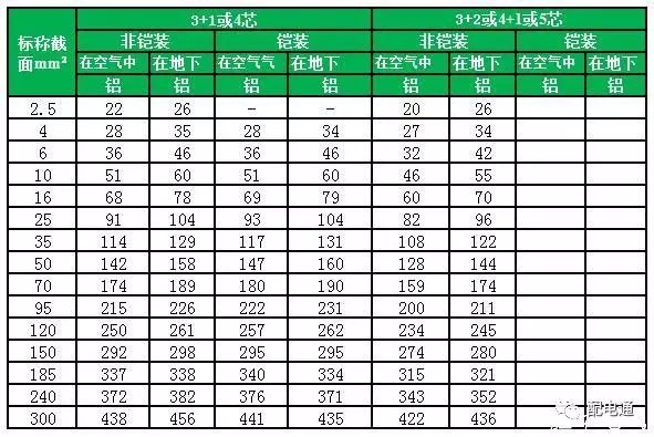 3+1、3+2、4+1、4芯、5芯YJV、YJY、YJLV、YJLY(包括钢带铠装)0.6/1kv~1.8/3kv电缆载流量: