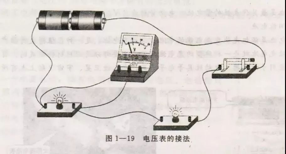 (3)直流电压表表壳线柱上表明的“+” “-”记号,应和被测两点的电位相一致,即“+”端接高电位,“—”端接低电位,不能接错,否则指针要反转,并会损害电压表(图1-19)