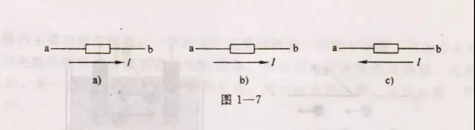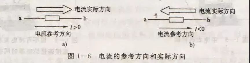 在分析和计算较为复杂的直流电路时,经常会遇到某一电流的实际方向难以确定的情况,这时可先任意假定一个电流的参考方向,然后根据电流的参考方向列方程求解。如果计算结果I>0,表明电流的实际方向与参考方向相同(图1——6a);如果计算结果I<0,表明电流的实际方向与参考方向相反(图1——6b)。