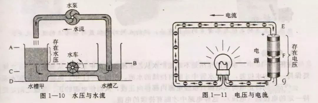 在图1——10中,水泵的作用是不断地把水从乙水槽抽送到甲水槽,从而使A、B之间始终保持一定的水位差,这样水管中才能有持续的水流。在图1—11中,电源的作用和水泵相似,它不断地将正电荷从电源负极经电源内部移向正极,从而使电源的正、负极之间始终保持一定的电位差(电压),这样电路中才能有持续的电流。