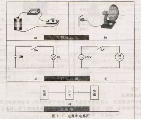 如图1——1a所示,用开关和导线将干电池和小灯泡连接起来,只要合上开关,有电流流过,小灯泡就会亮起来。与此相似,将电风扇接上电源,只要合上开关,有电流流过,电风扇就会转起来(图1——1b)。像这样电流流通的路径称为电路。