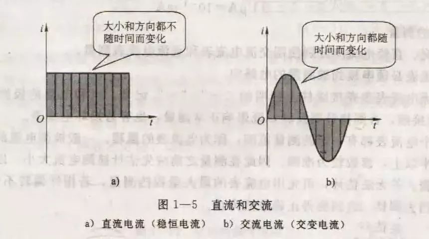 若电流的方向和大小恒定不变,则称其为稳恒电流(图1——5a),简称直流,用DC表示。若电流的大小和方向都随时间而变化,则为交变电流(图1——5b),简称交流,用AC表示。例如图1——1所示电路,小灯泡是由直流电源(干电池)供电的,称为直流电路;电风扇是由交流电源供电的,称为交流电路。
