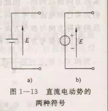 电源电动势在数值上等于电源没有接入电路时两极间的电压。电动势的方向规定为在电源内部由负极指向正极(图1—13)。