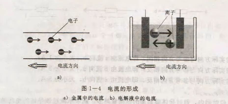 电路中有电流通过,也就意味着电路中有电荷处于移动状态,移动的电荷又载流子。载流子是多种多样的,例如,金属导体中的自由电子、电解液中的离子等。载流子在外加电压的作用下产生有规则的涌动,便形成了电流(图1——4)。