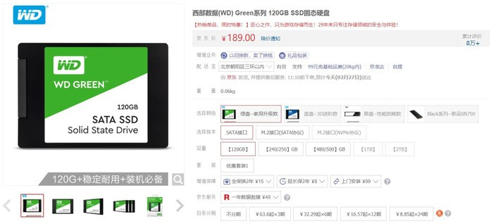 在测试之前,先来了解一下这款SSD,它的型号是西部数据 Green系列 120GB,大家一般称为西数绿盘,有M.2和SATA两种接口,机械硬盘里的绿盘就更不用介绍了。朋友买的是SATA接口、120GB的型号(下文中的西数绿盘都特指这款120GB的)共有4.3万+的评论,而这个商店页面的总评论有8万+,也就是说这一型号就占了一半以上的销量,这么多人买,加上西数大品牌,所以很多人都觉得会靠谱吧。