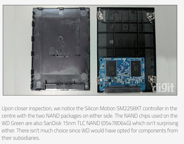 但在进一步的了解以后,我发现这款产品还有不同的主控,在找到的两家有拆解评测的网站,美国的HARDWARE SECRETS和印度的digit评测中,西数的绿盘都使用了慧荣的SM2258XT。