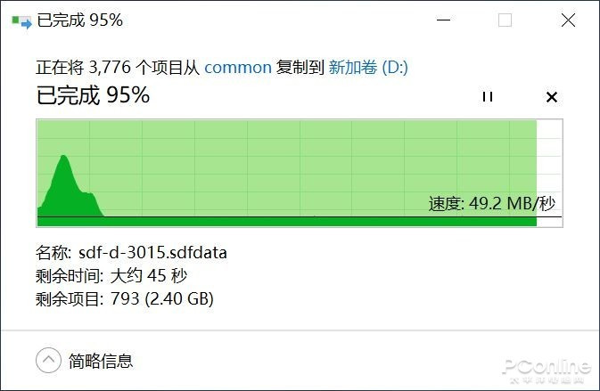 将一个49.4GB的文件夹复制到这款西数绿盘中,可以看到除了在开始的5GB中,写入速度达到了峰值后,在7GB到结束一直都处在50MB/s左右的成绩,只能说速度非常感人了。
