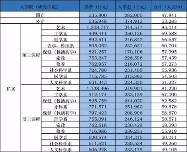 日本国公立大学的学费可以说是日本留学费用http://jp.weilanliuxue.cn中最精确的一个数据了,几乎不会有任何变动,同时这个费用在众多留学国家中处于比较低的一个水平,再加上日本很高的教育质量,确实是性价比很高的一种留学选择。如果说国公立大学的学费是最容易统计的数据,那么私立大学的学费则是留学费用中最难统计的数据,可以参考下图: