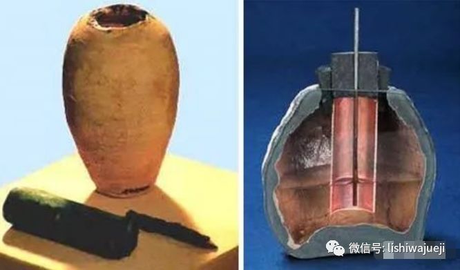 1936年在伊拉克首都巴格达城近郊外一个古代棺木内发现了一个陶器,高15厘米,瓶里装满了沥青。沥青之中埋有一根铜管,直径2.6厘米,铜管内有一层沥青,包着一根铁棒。只要向陶瓶内倒入一些酸或碱性水,便可以发出电来。这意味着,在公元前248就开始使用电池了。