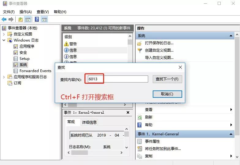 ②在打开的窗口中切换到Windows日志-系统,之后点击右侧窗,按下Ctrl+F搜索:6013