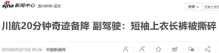 5月14日早上,四川航空由重庆飞往拉萨的3U8633航班,在四川空域内飞行途中时,驾驶舱右侧玻璃突然破裂,驾驶舱瞬间失压,气温降低到零下四十摄氏度……在意外发生后,万米高空中,机组副驾驶徐瑞辰半个身子被“吸”了出去,大量机载自动化设备失灵3U8633航班机长刘传健,在自动化设备失灵情况下,依靠二十年飞行经验,手动操纵,于7时40分左右,成功让飞机备降在了成都双流机场,挽救了119位乘客和9名机组人员的生命安全。整个备降过程前后仅仅20分钟。