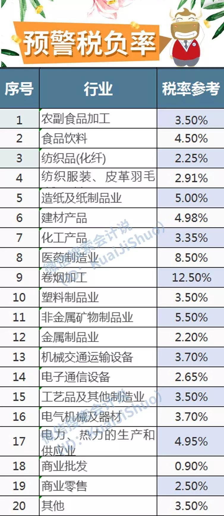 不同行业,不同地区,税局会根据当地、同行业来定一个税负,即应该交多少税(用百分比计算)。如果企业低于这个税负,系统就会发出预警,这时税局就会让你自查,甚至稽查。我们可以掌握在不低于行业平均税负率1%左右(商业企业1.5%左右)。今天给大家整理了最新各行业“预警税负率”。
