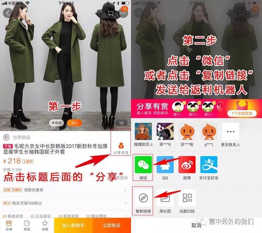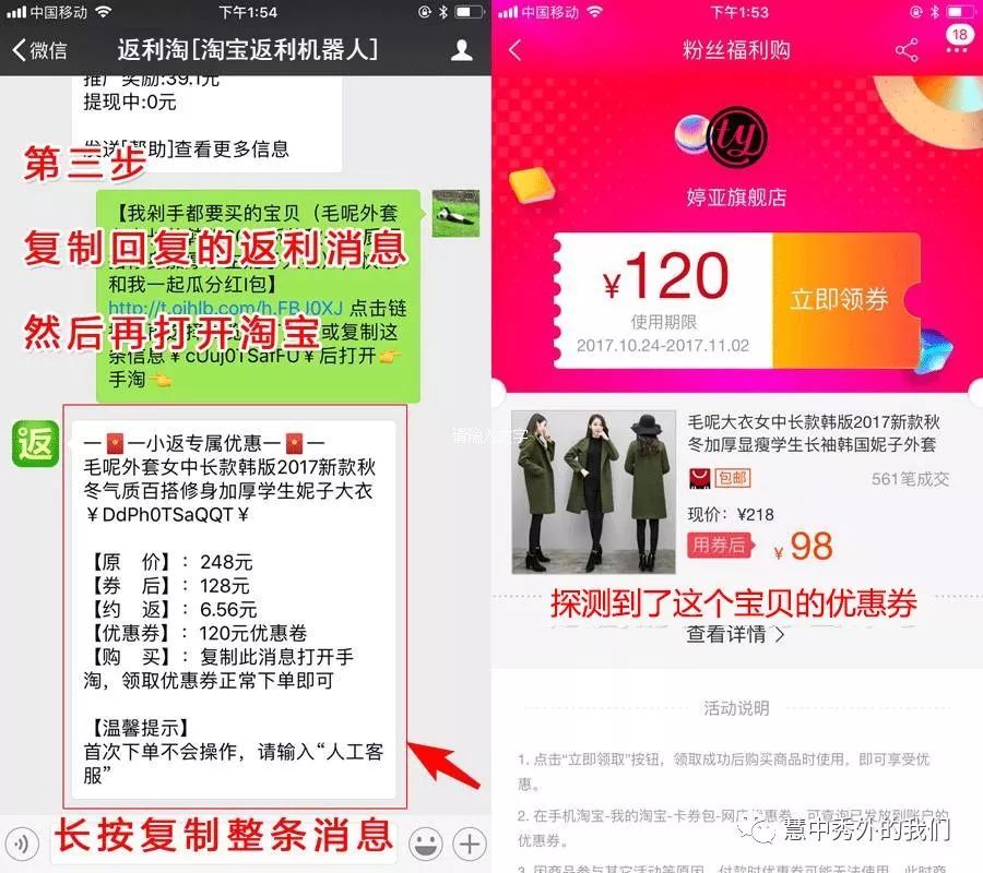 下图這件新款毛呢大衣,原价218,通过我们返利机器人居然查询到120元的大额优惠券,按照我们平常的购买习惯,也就是看看有没有店铺普通优惠券,但是店铺优惠券,一般都要达到一定的金额才能用!下面让我们一起来看看如何一步查到隐藏券的方法吧!
