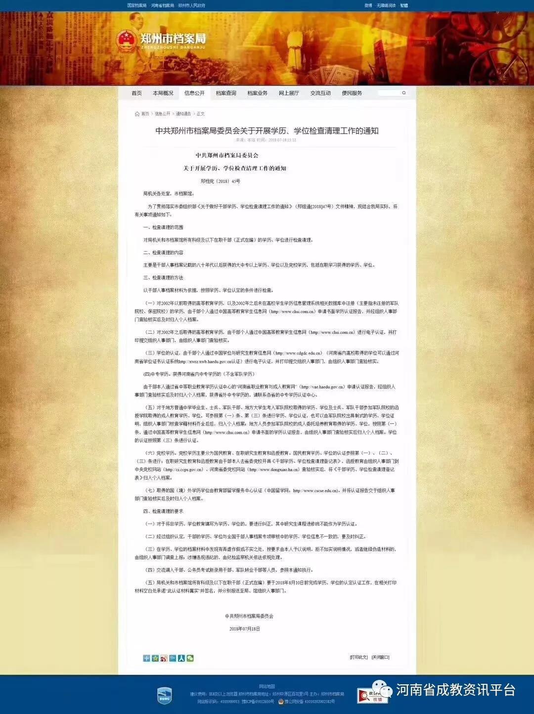 这是中共郑州市档案局委员会关于开展学历、学位检查清理工作的通知!郑州市开始严查学历,这可不是闹着玩的,如果有人以假学历获取工作岗位和利益关系,被清退什么的都还好说,万一被纳入个人诚信档案的话,那在未来基本上是寸步难行,基本上是已经毁了,尤其是现在的人对于诚信看的非常重要。