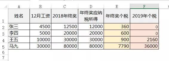 如果你公司2018年没发放年终奖,可以选择在2018年12月底发放,具体哪个更划算,兰色做了一个对比表:(E列是“年终奖/12”的算法,F列为并入2019年收入算法)