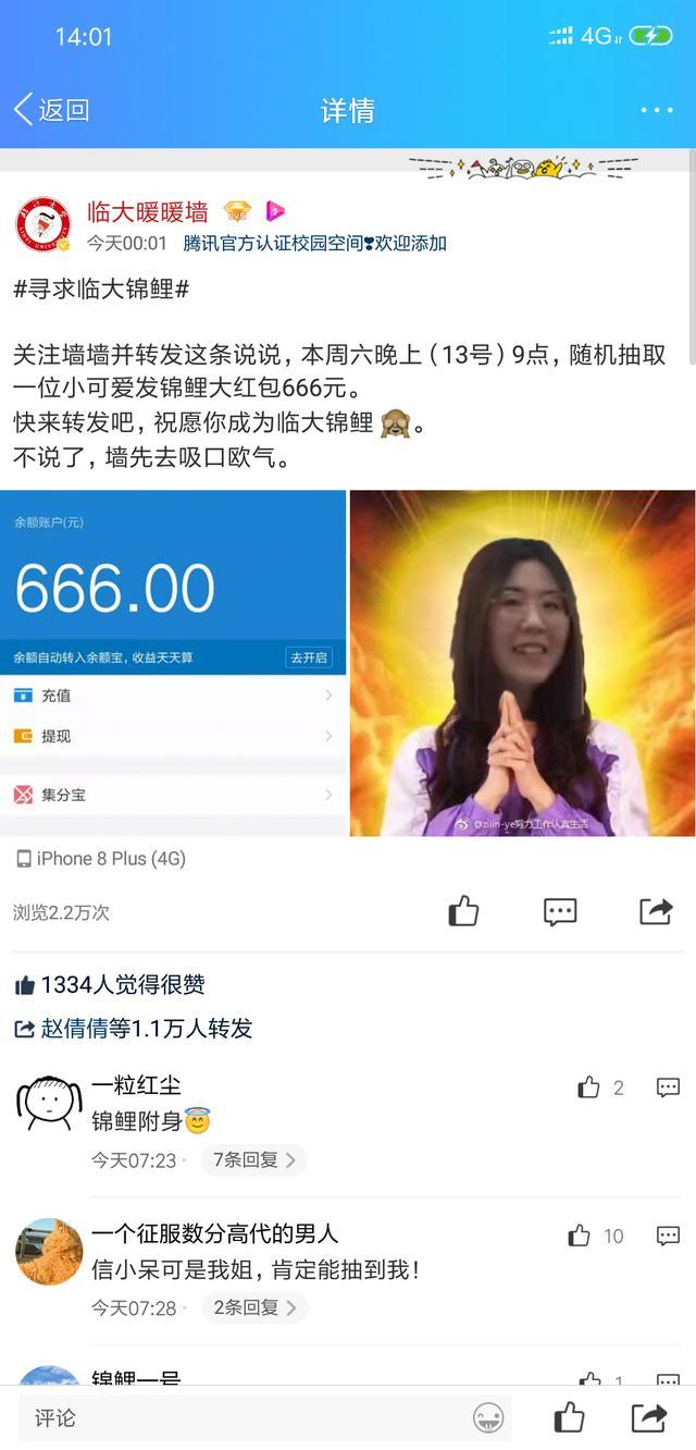 每条说说转发都过万,奖品都很诱人,有现金、清空购物车、实物,价值都在500元以上不等,文案大致都相同,寻找某某大学锦鲤。并且要求关注该账号,这样该账号就能涨粉。