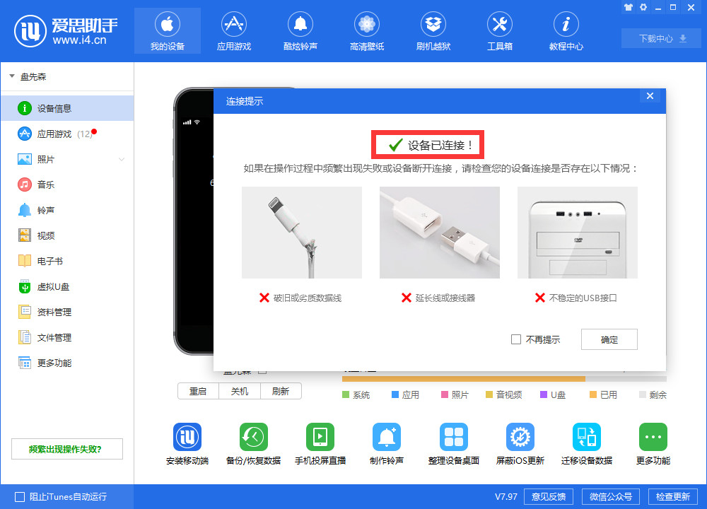 3、用数据线链接好手机