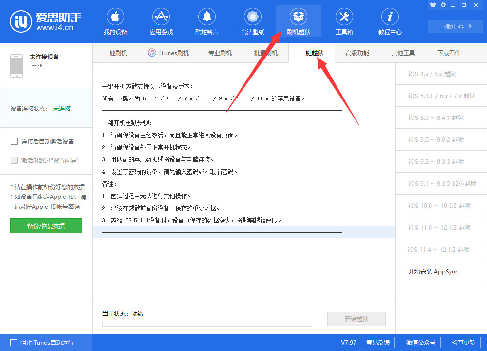 4、选择【刷机越狱】->【一键越狱】