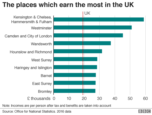 并列位居榜首的是西伦敦肯辛顿&切尔西(Kensington & Chelsea)、哈默史密斯&富勒姆(Hammersmith & Fulham)地区,两者的平均家庭收入是整个英国平均值的三倍,也就是58,816英镑之多。毕竟这两块地方都是伦敦著名的老牌富人区了……