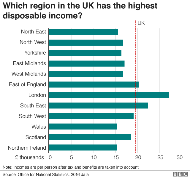 在可支配收入这个问题上,BBC的这个榜单就没那么细致了,不过大伦敦还是一马当先远超所有其他地区,而和伦敦一样高于全英平均水平的,只有英格兰东南部和英格兰东部▼