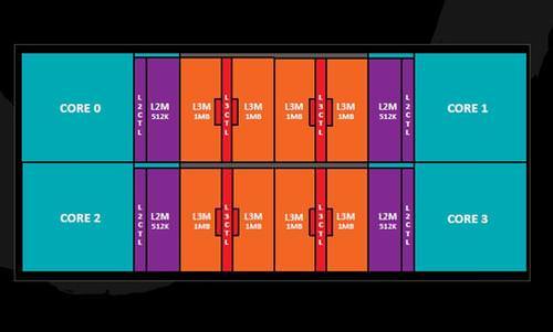 CCX在zen1和zen+中被设计为方形结构,核心位于CCX的四角,L2和L3则被排布到四个核心的正中间,L3大小为8MB,四个核心内部共享,速度同步于最高的核心。同时四个core之间都可以随意和其他core共享通讯,周期极低。
