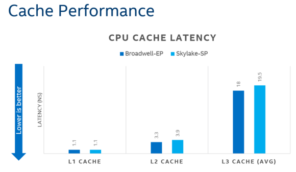 在新的架构下,intel将核心排布为棋盘状,比Ring架构自由的多,并支持连接更多的核心。不过因为架构的原因,其缓存速度较Ring慢,intel自己的说法,会增加10%延迟,但是实现了更低的功耗。intel也在搭载Mesh的skylake - SP中加入了更大的L2缓存。