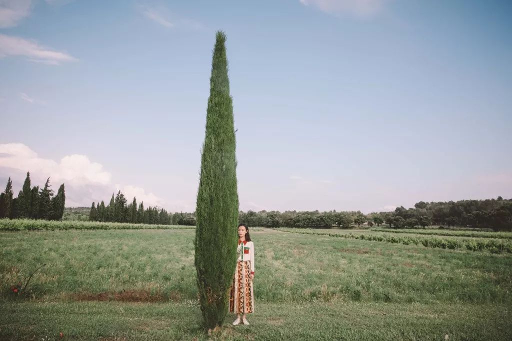 要想把人拍瘦一些,就要找一个大的背景,这样你在画面中的比例就会小一些。这张是倪妮最近在南法拍的,和旁边的树是不是有很鲜明的对比呢▼