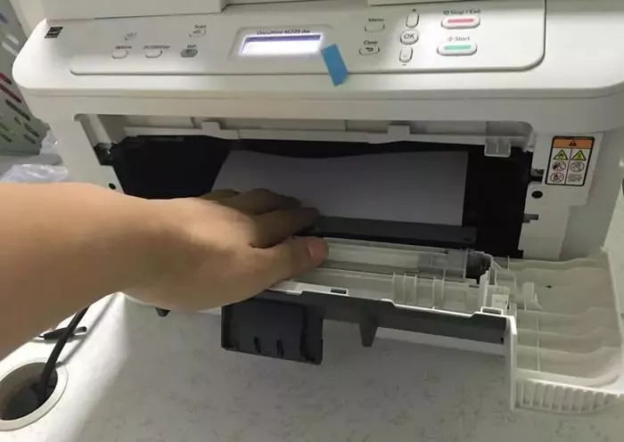 关闭电源等待散热完成后,取出打印设备中的耗材,此时可以看到“定格”在打印机内的卡纸,可以根据卡纸的情况,决定从外还是从内抽出纸张,但建议沿着出纸方向取出纸张会相应降低取卡纸难度。此时要特别小心,要防止纸片遗留在打印机内部。