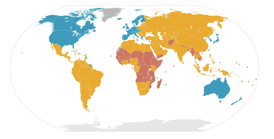 世界各国耕地面积占国土总面积比例示意图(数字单位为百分比):从图中可以看出,耕地面积比例高的区域主要为欧洲和南亚地区。