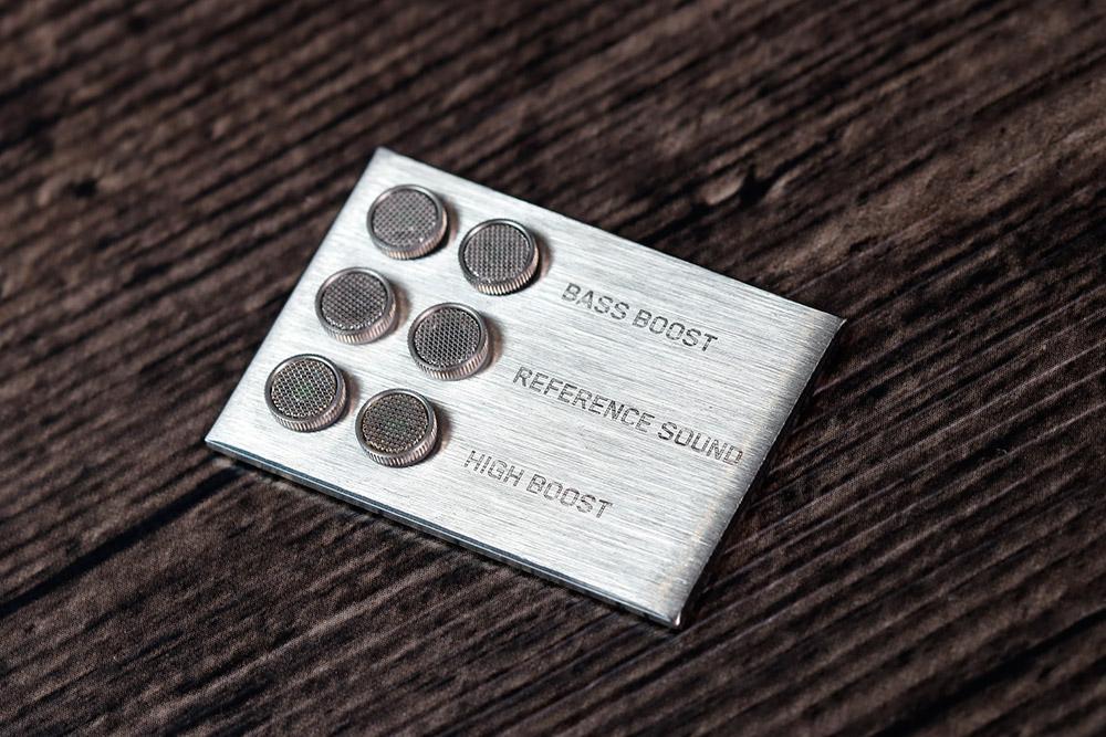 要说AKG3003最有趣的地方,其实还是它那个可以更换的滤波网。在K3003的包装里你能找到一个金属片,上面放了2对金属滤波网。分别是对应低频和高频的增强滤波网,而空着的那对“Reference”就是在K3003上默认使用的“参考级”均衡滤波网。每个滤波网上都有一个不同颜色的橡胶圈来区分,高音增强是白色的,参考级声音是灰色的,低音增强是黑色。