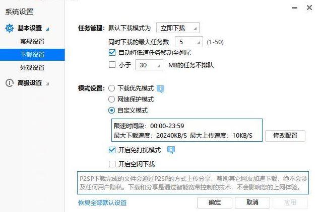 打开“菜单”--“系统设置”--“下载设置”,选择右边的“自定义模式”,然后选择“修改配置”。