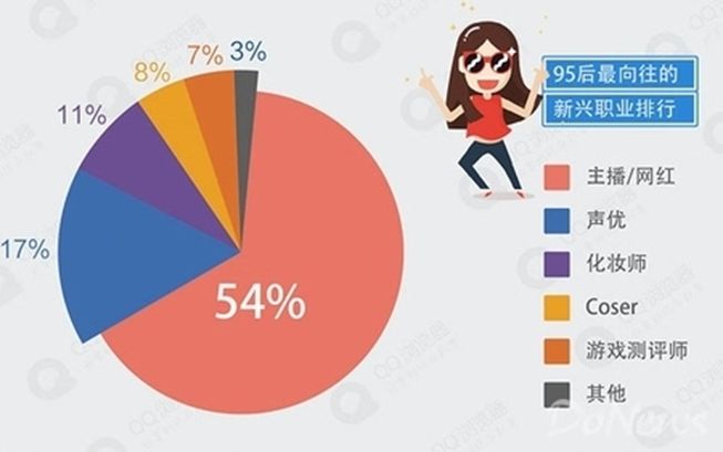 QQ浏览器曾发布高校毕业生毕业去向的大数据报告。报告显示,在95后最向往的新兴职业排行榜中,有超过54%的受访者表示最理想的职业是网红。
