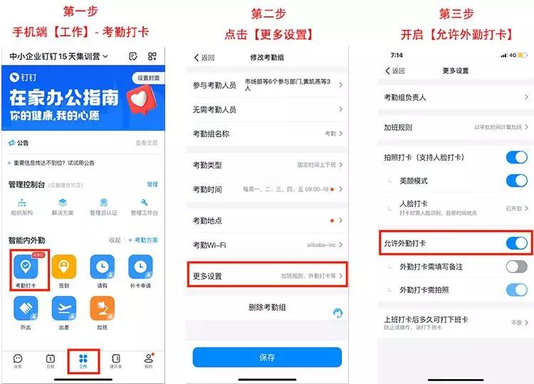 对此,人事部可提前向全员规定每日开工时间并同步线上平台设置。比如,钉钉支持员工“外勤打卡”——(若约定9:00上班)大家均可在9:00前打卡。打卡完成,领导随即接受打卡通知,方便后续工作安排。