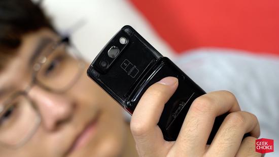 在收起状态下,LG KG90 的摄像头可以收纳在手机的上下两层之间,从而很好得保护摄像头模组,这种设计和 OPPO Find X 采用的将前后相机模组收纳进机身的全隐藏式摄像头设计有着异曲同工之妙。