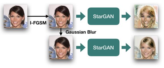 在灰盒测试的设置中,干扰者不知道用于预处理的模糊类型和大小,因此模糊是一种有效抵御对抗性破坏的方式。低幅度的模糊可以使得破坏失效,但同时可以保证图像转换输出的质量。下图 5 展示了在 StarGAN 结构中的示例。