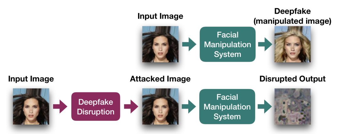 与对抗攻击相同,如果我们给图像加上一些人眼无法识别,但机器又非常敏感的噪声,那么依靠这样的图像,deepfakes 就会被攻击到。