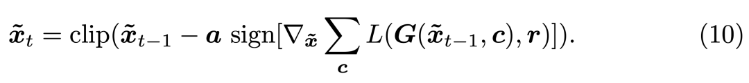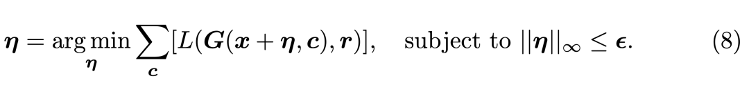 之前添加噪声是不带条件的,但很多换脸模型不仅会输入人脸,同时还会输入某个类别,这个类别就是条件。如下我们将条件 c 加入到了图像生成 G(x, c) 中,并希望获得令损失 L 最大,但又只需修改最小像素 η的情况。