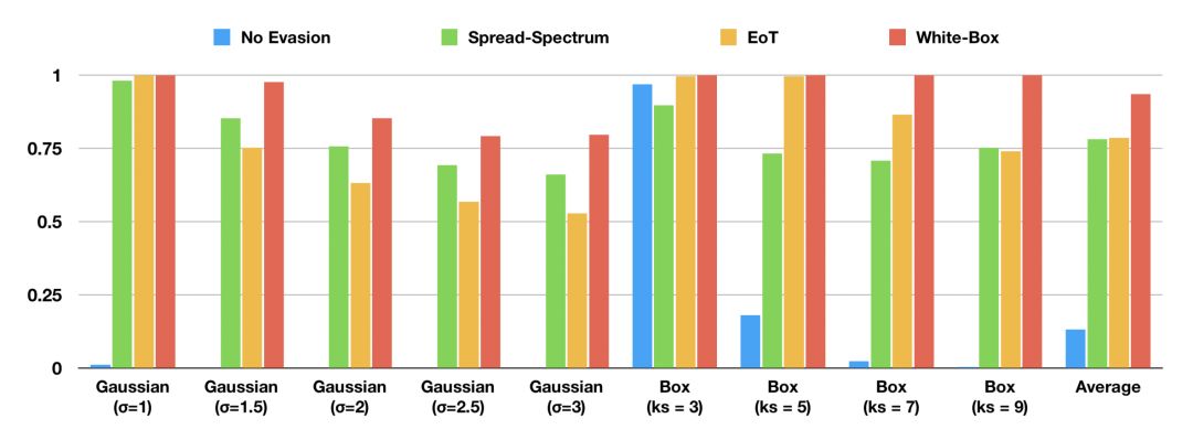 在灰盒(gray-box)场景下,使输入图像变模糊可以成功地防御攻击,研究者展示了一个能够规避这种防御的攻击方法。
