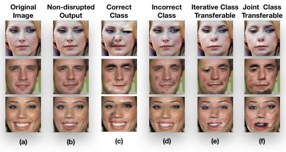 如上图所示,a 为原始输入图像,它在不加入噪声下的 GANimation 生成结果为 b。如果以类别作为约束,使用正确类别后的攻击效果为 c,而没有使用正确类别的攻击效果为 d。后面 e 与 f 分别是研究者提出的迭代类别可迁移攻击效果、联合类别可迁移攻击效果,它们都可以跨各种类别攻击到 deepfakes 生成模型。