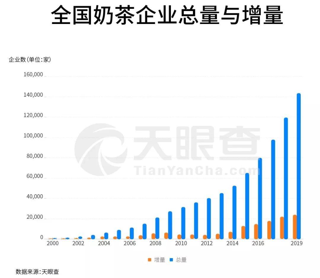 天眼查显示,截至11月27日,经营范围内包含“奶茶”的企业共有约14.3万家。从2015年开始,奶茶相关企业的增长数量已过万,其中2017-2019年新增数量分别为1.79万家、2.18万家及2.37万家,今年的增长量为史上最高。