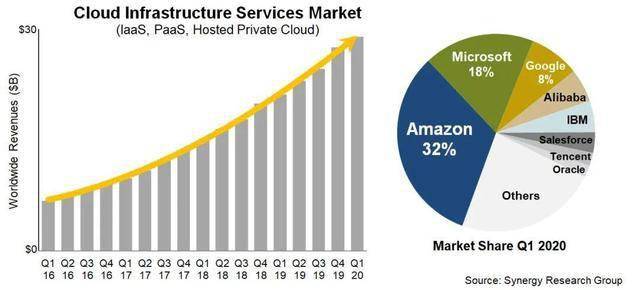 Synergy Research Group的新数据显示,亚马逊在2020年Q1以32%的市场份额位列首位,排名第二的微软,其市场份额达到18%。在公共云市场,前五大提供商控制着四分之三的市场。