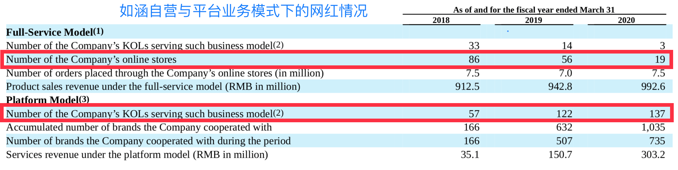 这个转型效果可以从财务数据中得到体现。上面这张表显示,转型伊始的2018财年(2017.4.1-2018.3.31)如涵已经把更多网红资源分配给平台业务,当时有33名网红服务于自营业务,到2020财年时已降至3名,就是女性消费者熟悉的张大奕、温婉等人,对应的以这些网红命名的淘宝自营店铺数量也从86家降至19家,但在自营的订单量、交易额方面与历史持平。