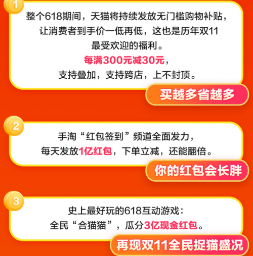 特别要说的是,整个天猫618期间,每天还有超1亿红包雨:从5月29日至6月18日,天猫618的五轮红包雨分别是最给力红包、最好玩红包、最“齐心合力”红包、最守时红包和最惊喜红包。
