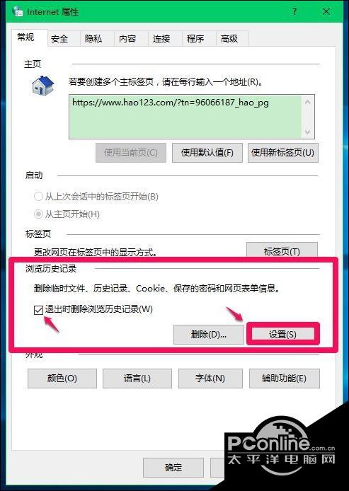 10、我们也可以进入【控制面板】,点击【Internet选项】,在打开的Internet 属性窗口,点击【浏览历史记录】项的【设置(S)】(在退出时删除历史记录复选框内打勾);