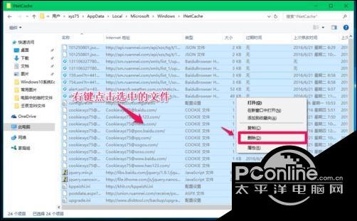 12、INetCache文件夹显示的都是IE临时文件,我们按下键盘上的Ctrl+A键,选中全部临时文件,右键点击,在右键菜单中点击:删除;