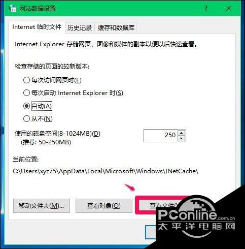 11、在打开的网站数据设置窗口,点击【查看文件】,也可以打开INetCache文件夹(IE高速缓存临时文件夹);