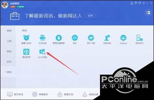 2、在腾讯电脑管家的工具箱页面中,找到其他或者是软件功能按钮点击进入,找到win10检测;